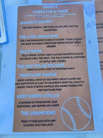 Asher says that he enjoys working and donating to help as he continues Asher's Cones for a Cause. He is planning another snow cone afternoon in mid July and will post the date on social media. His expanded menu celebrating the Vols Championship includes OMAVOLS Orange, a pina colada and orange mix, and Billy Bomb for Billy Amick, a mixture of apple and cherry. There is also a sugar-free flavored cone, and other sweet flavors too.