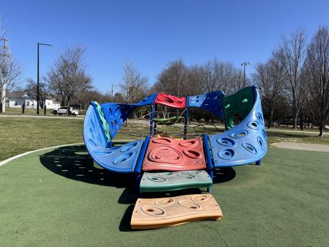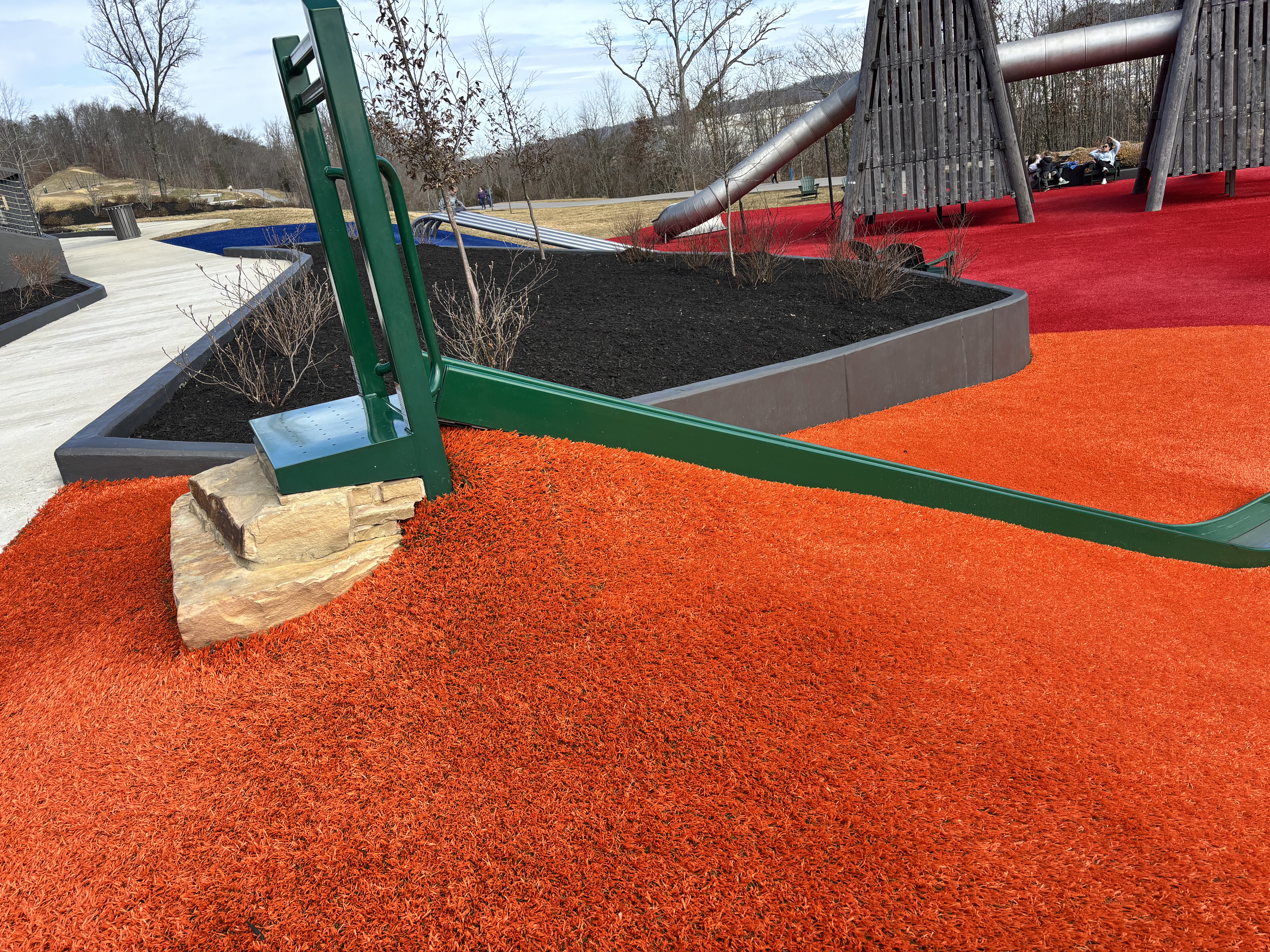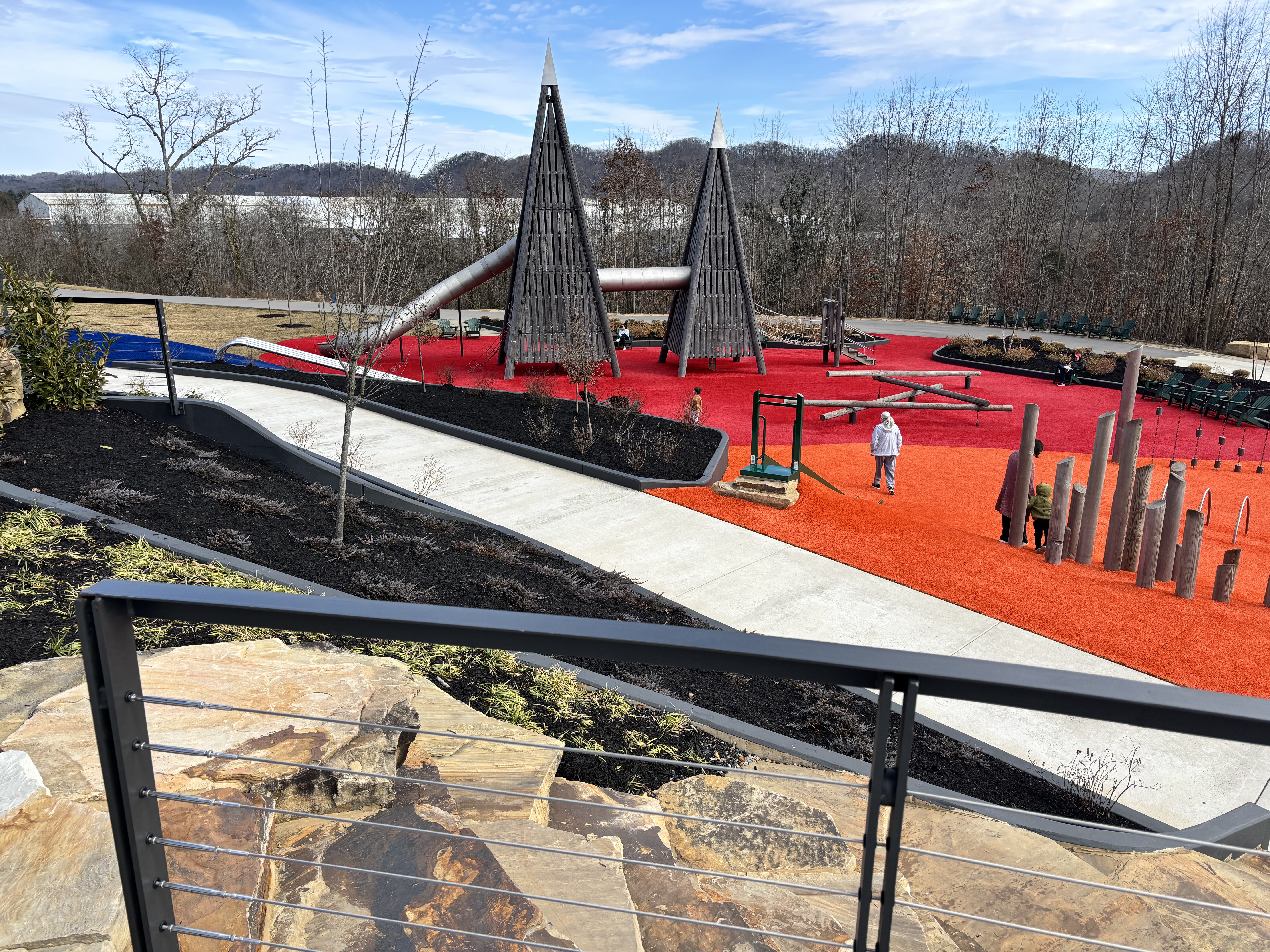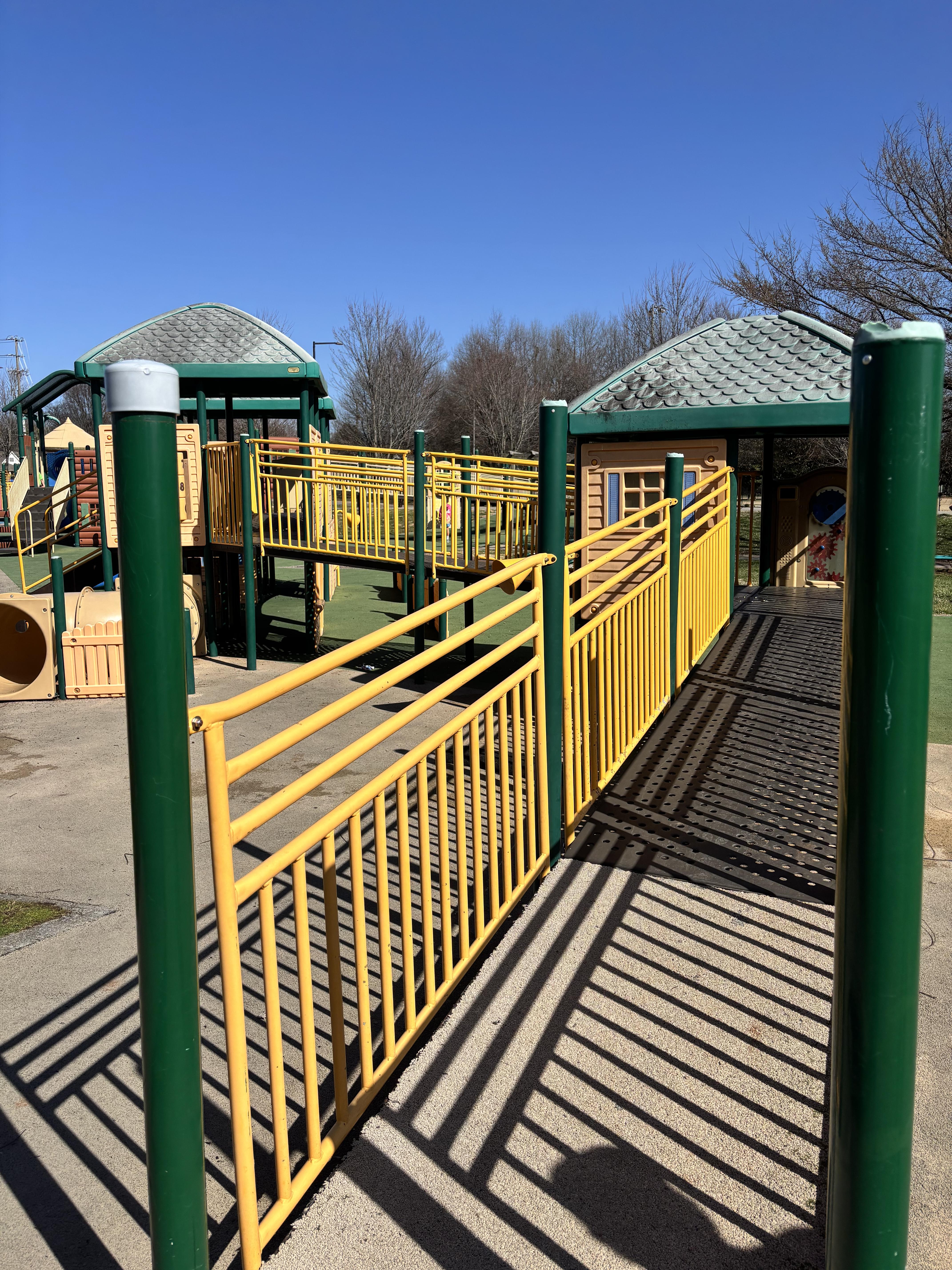 It is listed as an all-inclusive playground, but I found that description disconcerting. I do not travel by walker or wheelchair and do not have children with disabilities, so I have no experience in the assessment of all-inclusive play areas. But most of this gorgeous, very large playground is on a hill that gets pretty steep in places. The only easily accessible piece of equipment that we could find was a small slide set into a hill. Access to the slide is via a paved, sloped pathway. There are 2 small steps to get onto the slide, which is set in the hillside. When you get to the bottom and want to get back to any transportation you may have, it is a short uphill climb back to the paved pathway.