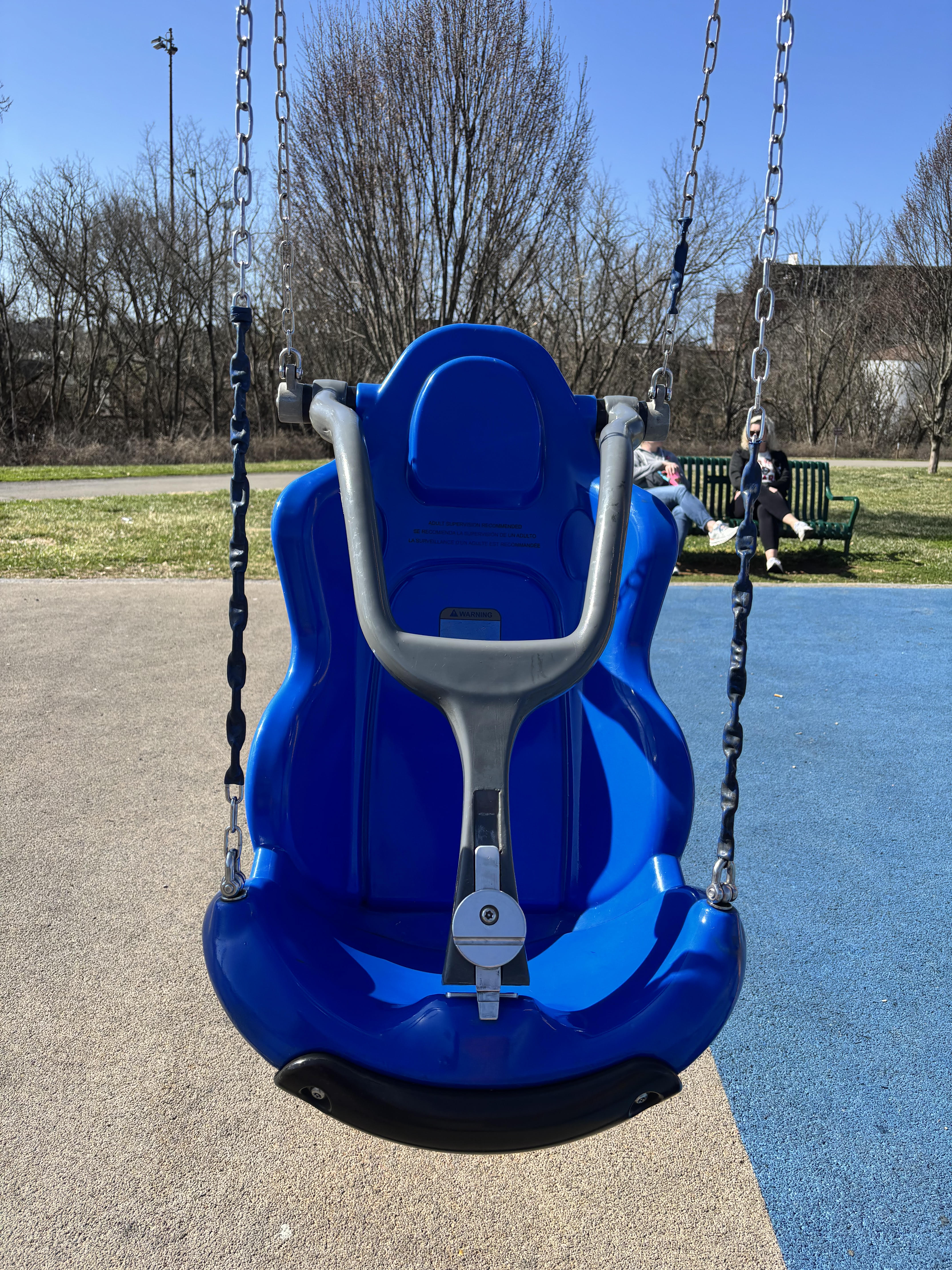 What was most striking to me about these all-accessible playgrounds was how alike they were and yet how different. Only one, for instance, had a fence around it (Karns), and I would have thought it safer to prevent kids of all ages from wandering, especially wandering into a parking lot. Every kid I’ve known has loved slides, but several of these areas required climbing a ladder to use them. Two do not have seats on any of their swings. Only one had a merry-go-round with seats.