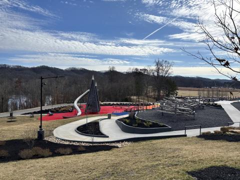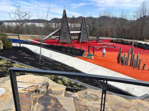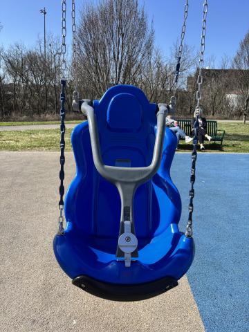 Our final playground was the Ashley Nicole Dream Playground on Winona St in Knoxville. Ashley Nicole Manes suffered injuries in a 1999 auto accident that left her paralyzed. This playground was built in her honor and opened in 2005. As part of Caswell City Park, this playground was unfenced. The area was flat, and the ground was covered with spongy outdoor carpeting. There is no age limit posted. Everything in this area appeared accessible to wheelchair users or walkers. There were many slides, and each had both ramps and stairs, so a child could choose their preferred access. While there was a small keyboard with sheet music posted above it and columns of letters and numbers that could be rotated, we did not note any other sensory-rich equipment. The playground was surrounded by an inviting, paved, flat walkway. The standard swing set did have one swing that had a substantial chair-like seat. Bathrooms were accessible. https://www.knoxvilletn.gov/cms/one.aspx?portalId=109562&pageId=204127