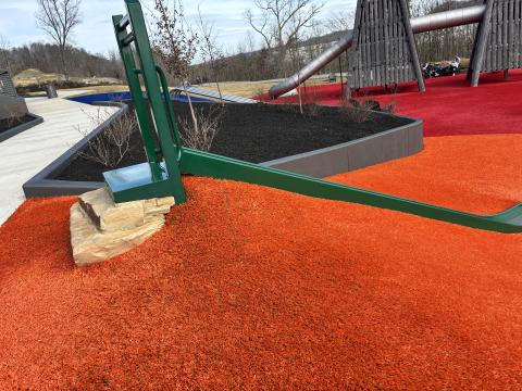 There is a kids' zip line low enough that a parent can run alongside for safety, if needed. Swings appeared to be standard swings. Much of the ground covering here is outdoor carpet, but it was not as spongy as the Karns' ground covering. And some of the equipment is surrounded not by carpeting but by mulch. Gorgeous. But not what I would consider accessible. And no fencing. Anywhere. https://alwaysaspire.com/things-to-do-v2/adventure-playground/