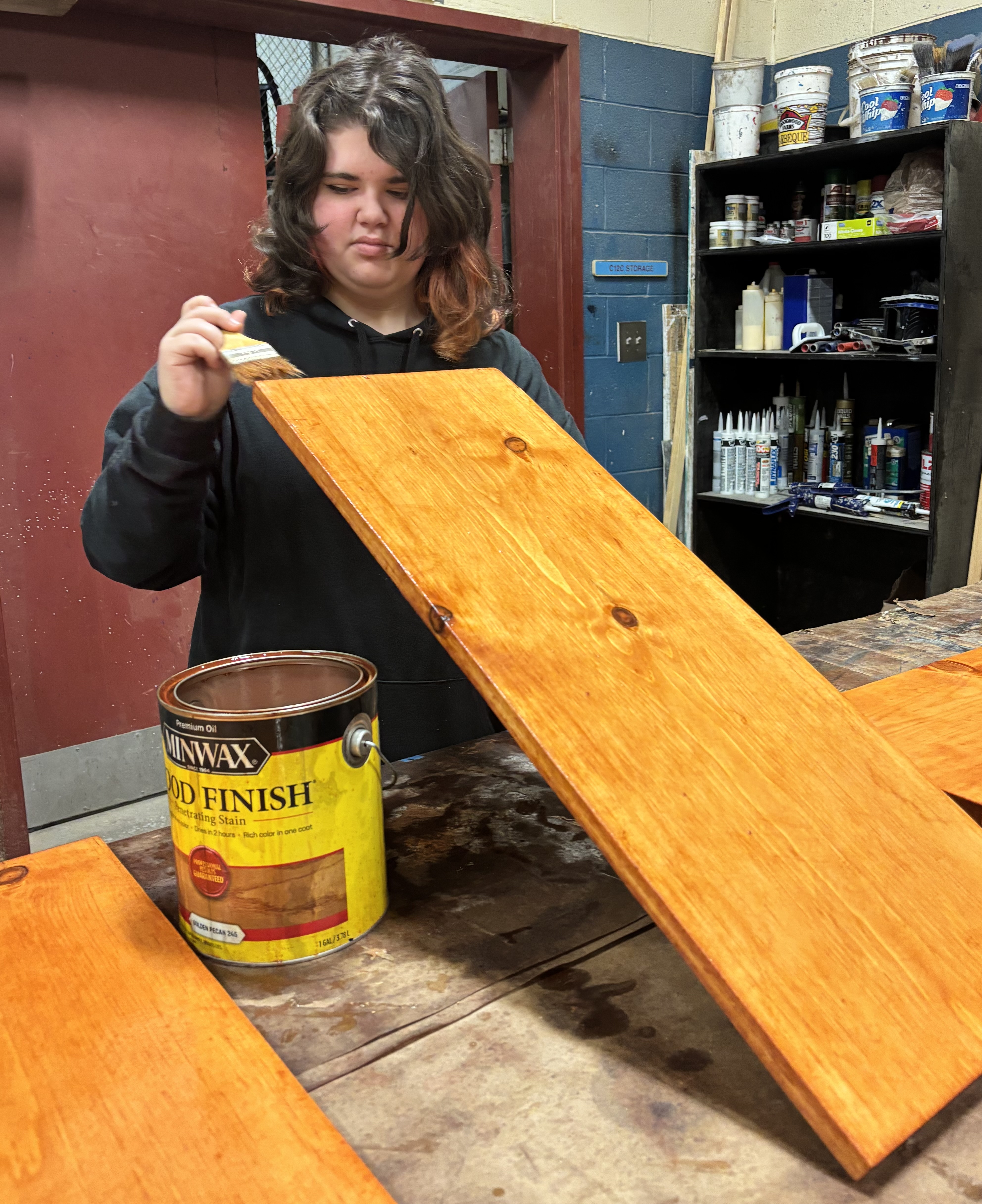 The boxes are beautiful, sturdy, and well-constructed. When I entered the shop, Madison Goings was carefully staining the lumber that would later be assembled into one of the boxes. She enjoys creating and working with her hands, and this project is right up her alley. The class goal is to complete a total of 20 boxes before the end of the semester.