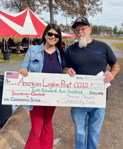 Amanda Rae Simpson presented Vice-Commander TJ Stanley with donations from the Sharps Chapel Fall Festival. (Photo courtesy Eddie Simpson)