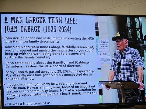 Charles Hamilton addressed the Union County Historical Society at its November 2025 meeting. Mr. Hamilton discussed the Hamilton Cemetery Association (HCA). Although the official deed date is 1901, the Hamilton Cemetery is one of Union County's oldest cemeteries with graves dating to the early 1800's. Graves include military veterans from the Revolutionary War, the Civil War, the Spanish American War, WWI, and WWII. There are over 36 family surnames represented with many including some of Union County's earliest pioneers. A section where slaves are buried is also at the cemetery.