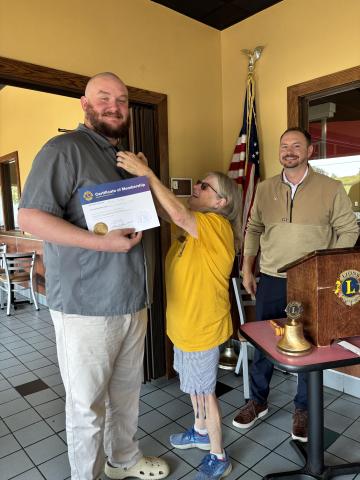 Chef Zach Hodge is inducted into the Union County Lions Club by Debbie Sylvia-Gardner and District Governor Daniel Hughes.