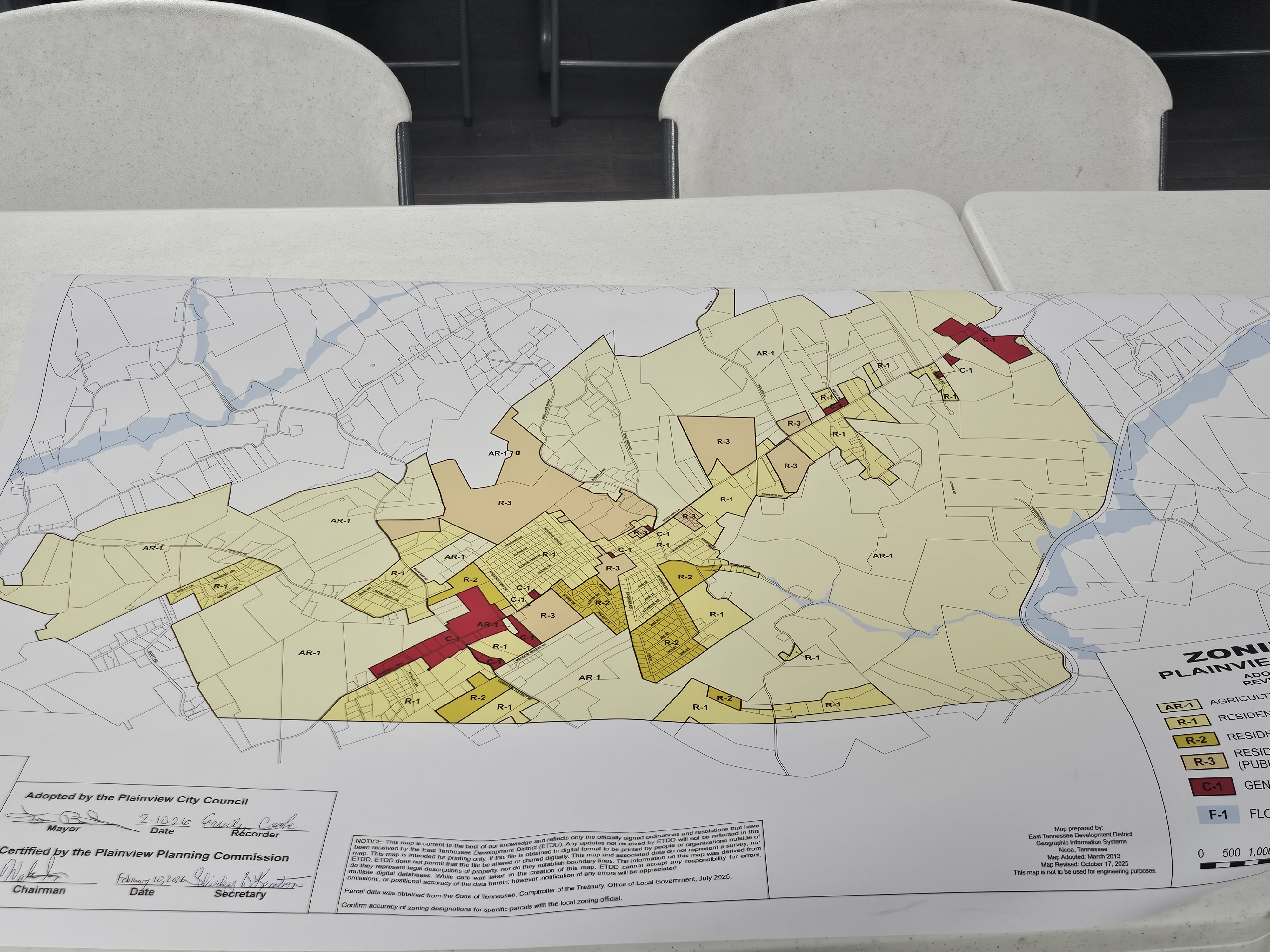 Stewart Skeen, Zoning Official, reported that he had recorded the Ballard plat and given copies to the property owners. A letter of renewal was sent to the state for Heritage Place. He wrote one permit for a mobile home in Woodbury Mobile Home Park on Monday Road. He fielded questions by phone regarding multifamily dwellings and was notified by Eddie Perry that he intended to open a second real estate office next to Rondo's. The Planning Commission also approved the subdividing of a minor lot owned by Headrick on Monday Road to allow a family member to have a dwelling. He noted that the updated map of Plainview had arrived and needed approval .Commissioners approved the new map of Plainview with one correction, the Curtis property should be AR-1.
