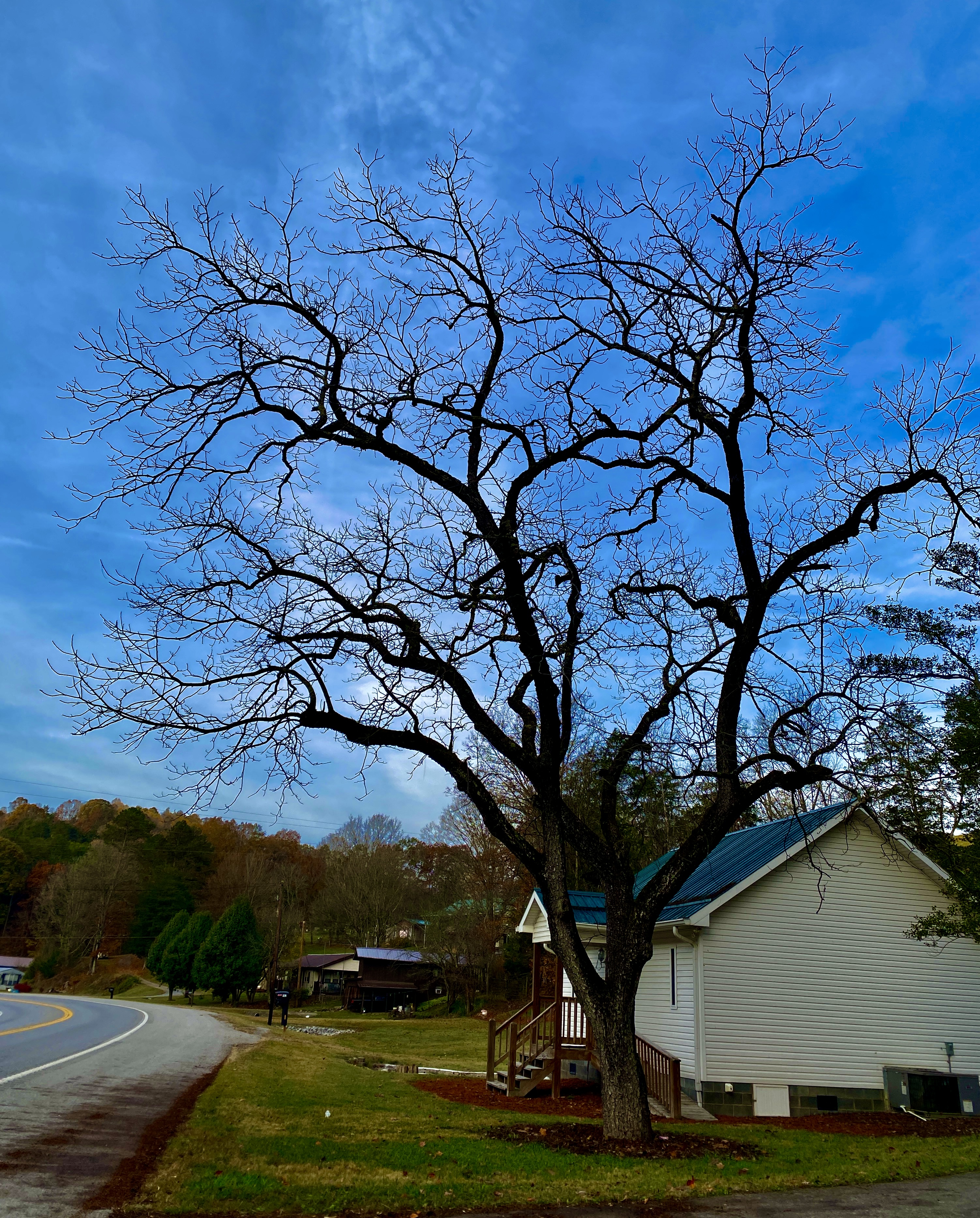 Black Walnut in silhouette has sparse limbs that can look like arms and twigs that look like long fingers that on a windy dark night look pretty spooky.