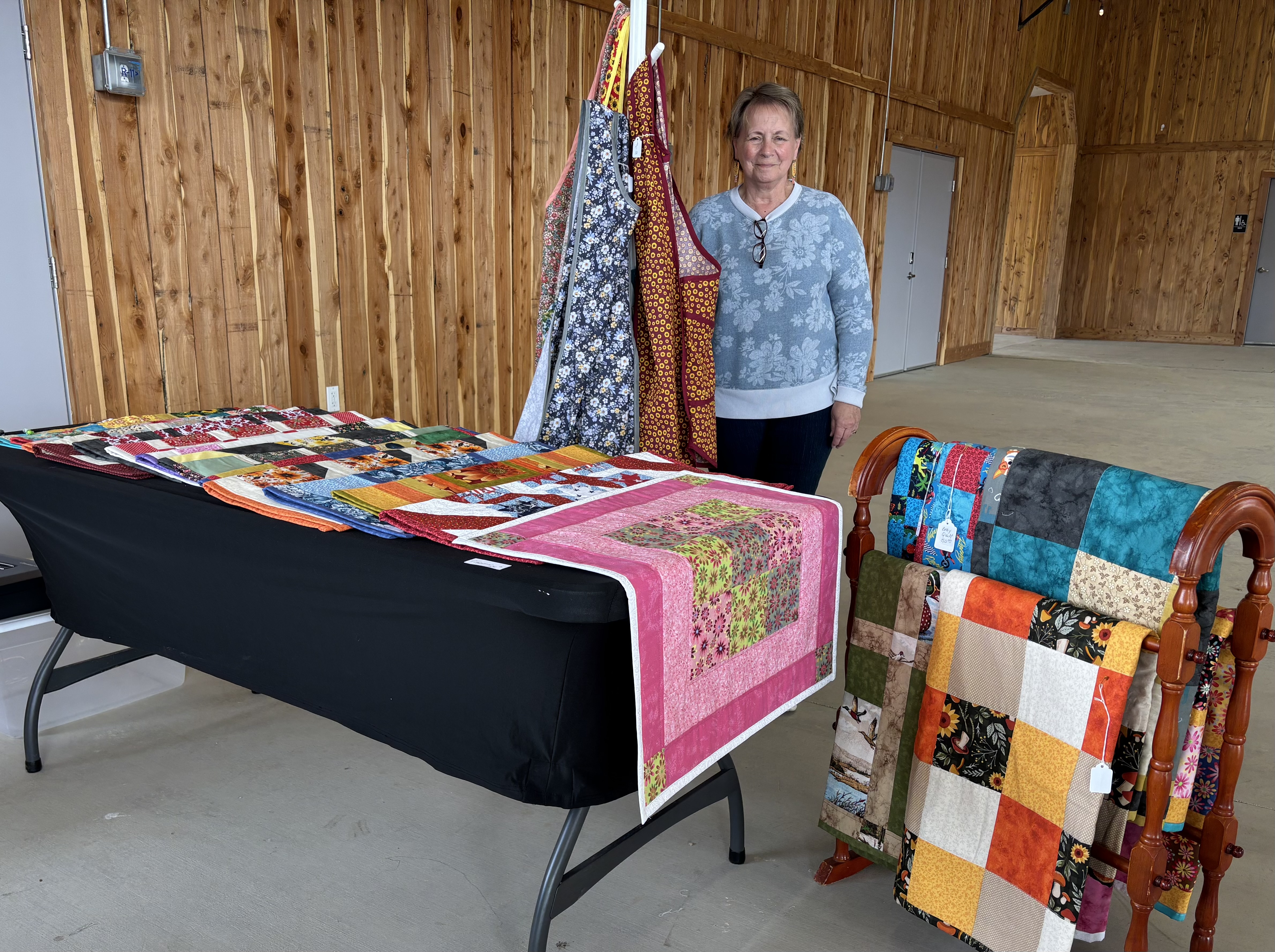 Union County resident Debra Keck of Keck Kackleberries + Krafts started in the egg business when her grandson became involved with 4-H over 20 years ago. For many years, she just sold eggs. Then COVID came, and she got bored. Debra has always sewn and loves doing so. In fact, in high school, she made all her own clothes. So, to pass the time, she started making beautiful baby quilts. From there, it just took off into reversible table runners and table toppers with organic fillers to absorb heat from hot dishes, as well as criss-cross aprons.