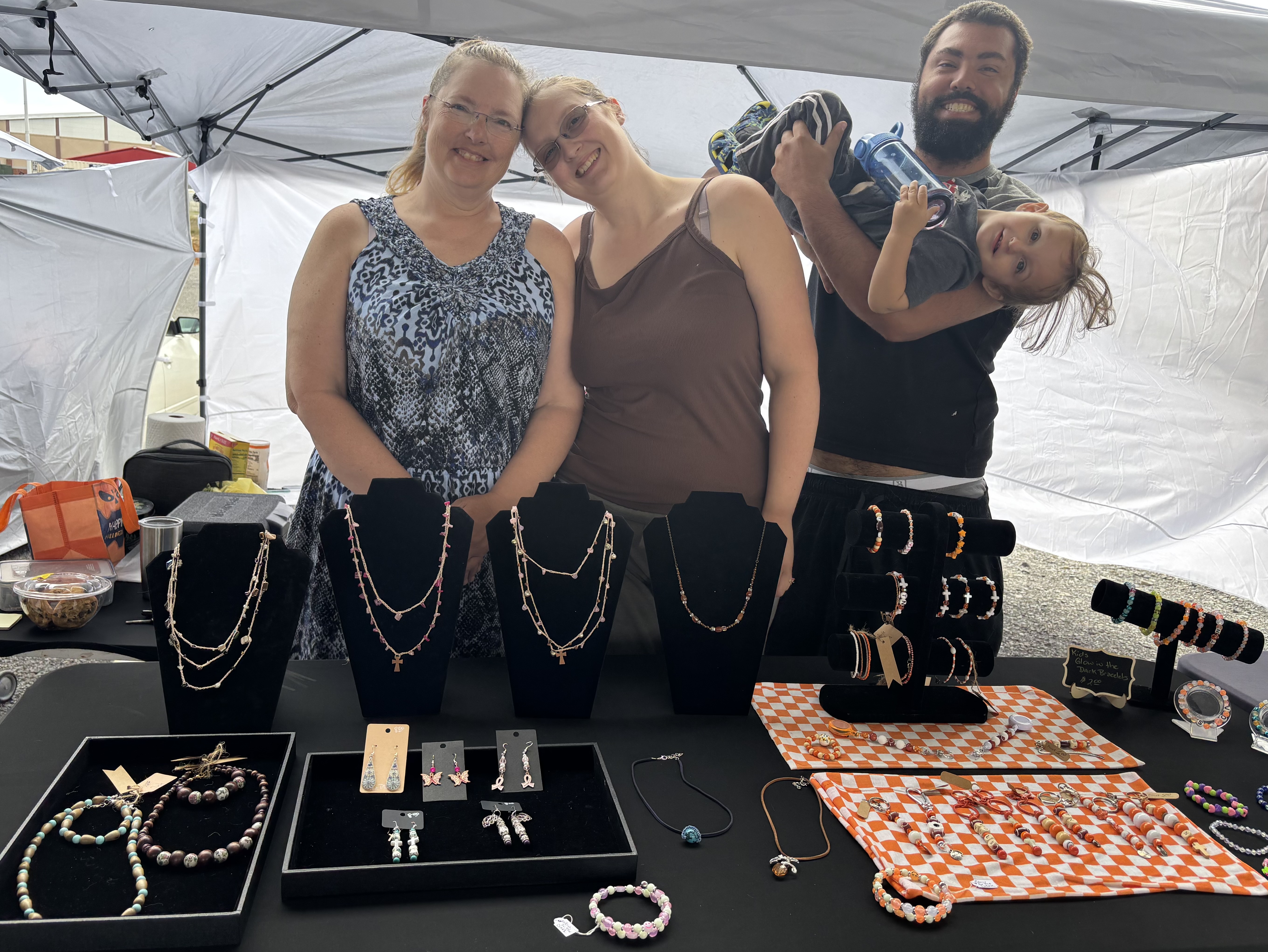 Tammy Salls crafts jewelry, keychains, badge lanyards, and offers a selection of pieces made especially for children. Her beads are made of wood, stone, glass, clay, ceramic, or metal, and, of course, a selection of TN Vols-themed jewelry. The jewelry for kiddos is built with safe materials. She uses strong elastic string for the bracelets and glow-in-the-dark acrylic and wooden beads.