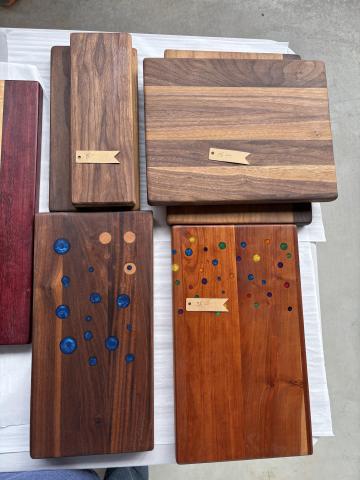 Mike Thobodeau is a longtime craftsman working primarily in hardwoods and Wire Art. His cutting boards are made from a variety of woods: black walnut, maple, and occasionally exotics like bloodwood. He uses copper wire, glass wire, glass beads, and local rocks for much of his exquisite work. Mike makes and sells River Tables, crafted from logs, with the tree's exterior texture and shape forming the table's edges. Unfortunately, he did not have one to display at this Market.