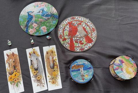Teddy Hammond absolutely LOVES doing beadwork and creating different designs through his Diamond Art business! His bookmarks, coasters, and sun catchers are beautiful and show such care and precision in placing the tiny beads. He has recently branched out to more complex, larger, framed pictures that look like paintings. When asked where he gets his ideas, he said they come from his imagination and his friends.