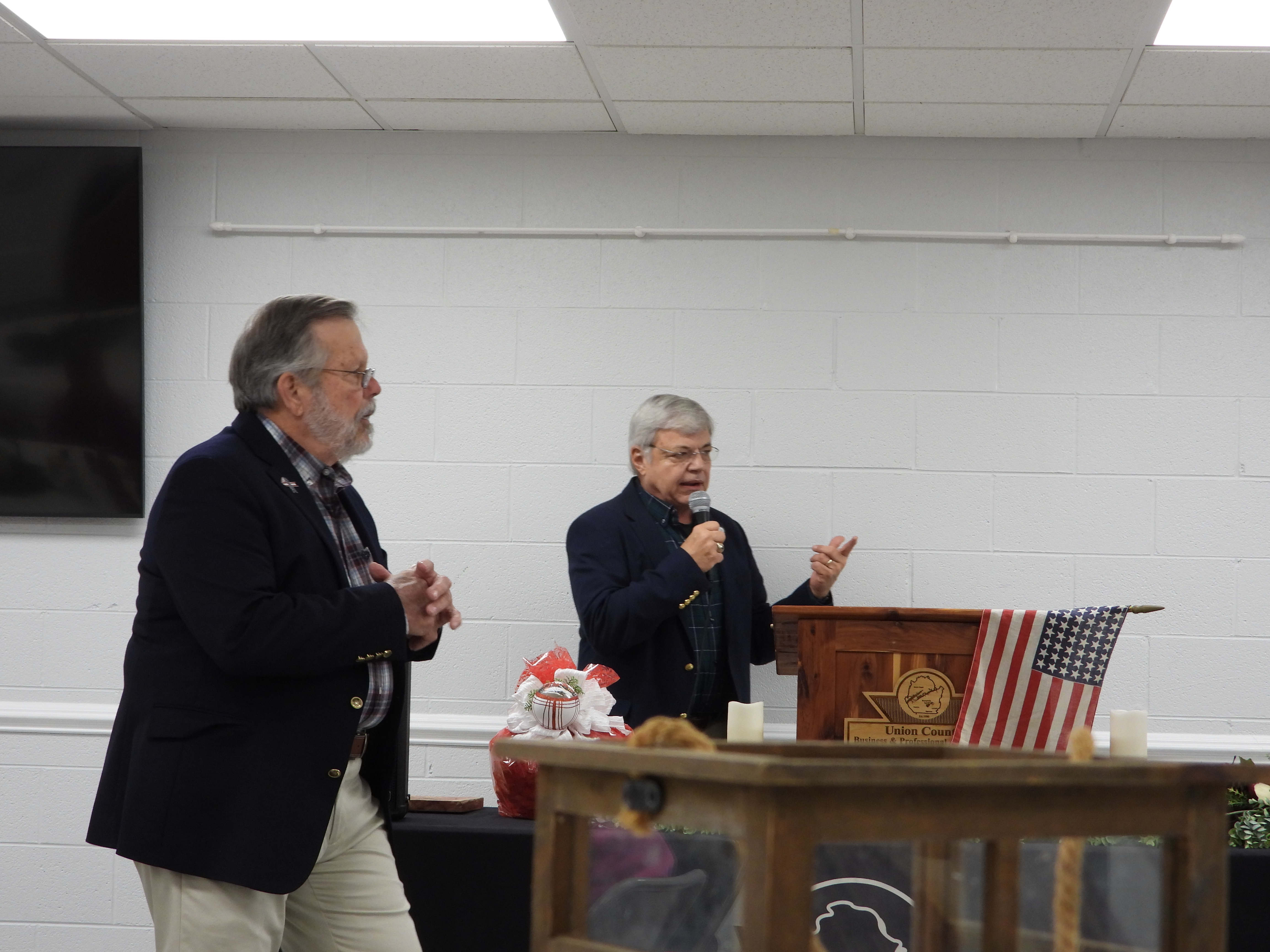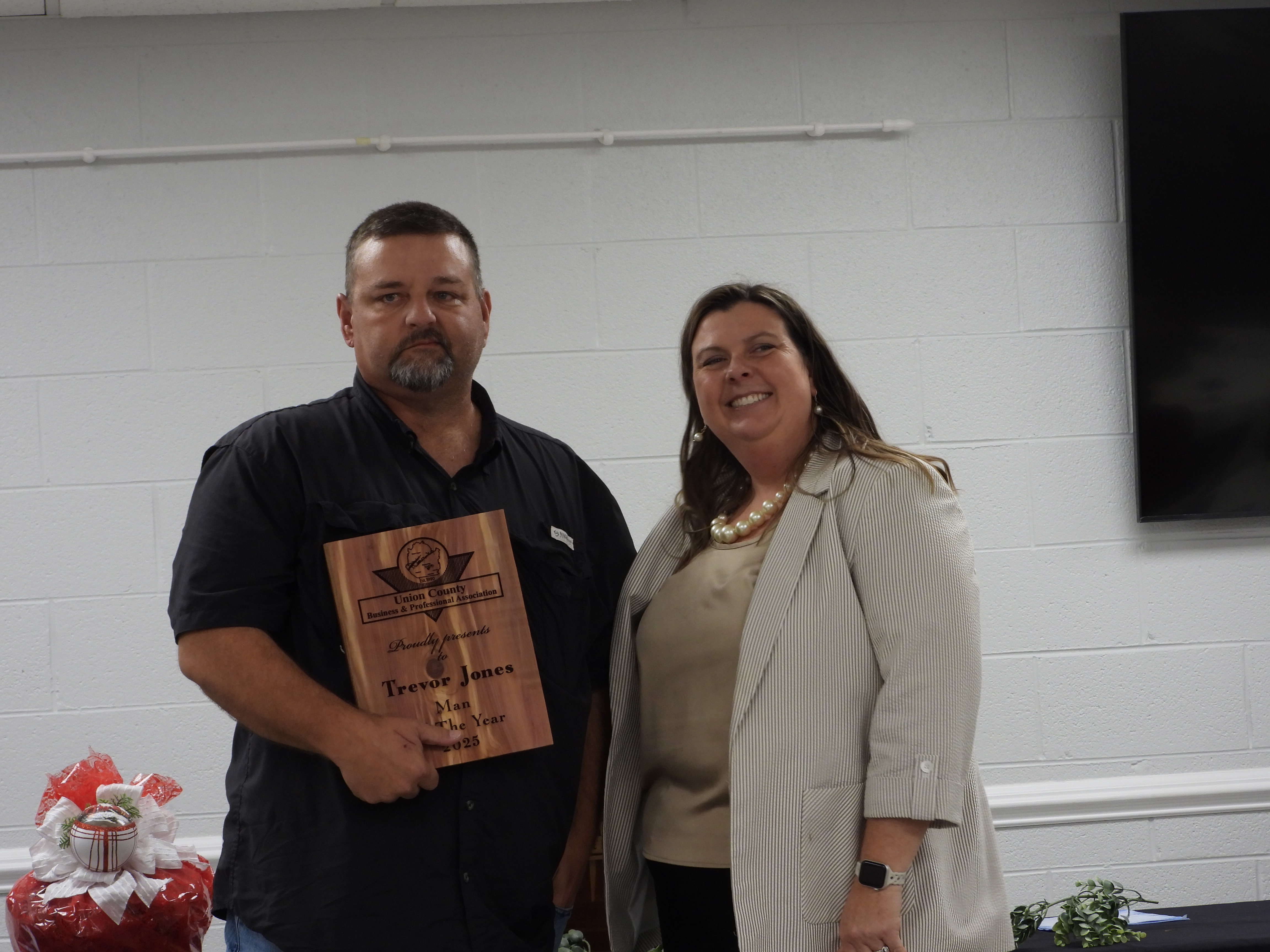 “Trevor Jones has always had a heart for agriculture and the people who make it possible. His commitment to Union County's farming community runs deep, and his efforts have created new opportunities for both local farmers and youth alike, “ stated Union County Extension Agent Shannon DeWitt as she introduced Jones. Trevor, the owner of Jones Farm and Livestock, is well known as a beef farmer for not only his own production but also for establishing a process to market beef from local farmers within Union County. Believing that young people should be able to raise farm animals, Jones has been a loyal supporter of 4H through fundraisers, contributions, and the showing of livestock. His latest endeavor will expand the in county market for cattle to include sheep, goats, pigs, and chickens. Sidney Jessee, Jr., Man of 2024, was at the state pig conference and could not attend. Sidney sent a congratulatory note that thanked Trevor for his help in raising pigs at the Jessee Family Farms. Sidney purchased some of his earliest pigs from Trevor as well as relying on him for expert advice. Trevor has provided employment and marketing outlets that have enriched the lives of Union County families.