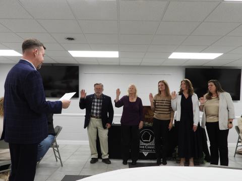Mayor Jason Bailey installed the 2026 Officers and Board Members, President Tammie Hill, Vice President R. Larry Smith, Secretary Charlene Kosegi, Treasurer Marilyn Toppins, Chairman Martin Shafer, John Hedley, Marcia Inklebarger, Tom Fitzharris, Heather Hoag, and Program Chairperson Shannon DeWitt.