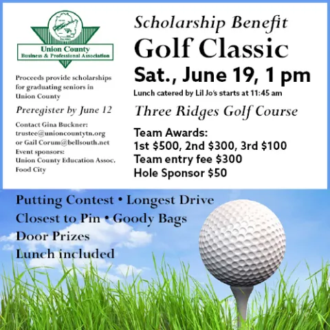 The 2021 golf tournament will be held at Three Ridges Golf Course on June 19, at 1:00 with lunch by Li'l Jo's Bar-B-Que beginning at noon. Event sponsors include Food City, Union County Education Association, and Collins Insurance (Putting Green).