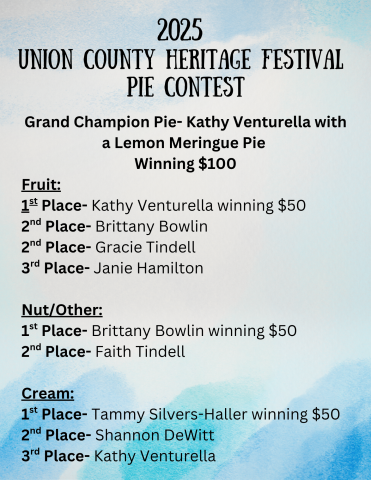 The annual Pie and Cake Contest at the Union County Heritage Festival was a huge hit this year, drawing an impressive 27 delicious entries from local bakers eager to show off their culinary talents. The sweet aroma of pies and cakes filled the air as judges sampled everything from fruit-filled creations to rich chocolate delights.