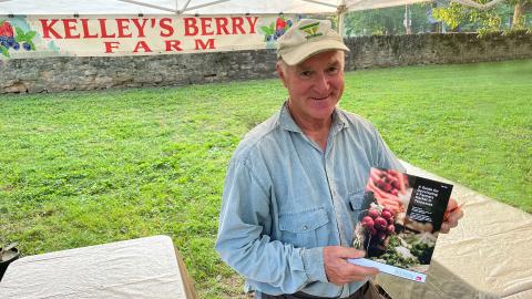 Owner of Kelley’s Berry Farm at the 12 South Farmers Market after selling out of berries on a market day in June was excited to hold a copy of the new publication in which he is featured. Photo by R. Painter, courtesy UTIA.