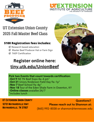 Farmers and cattle producers in East Tennessee will soon have the opportunity to take part in the Fall 2025 Master Beef Producer Program, offered through UT/TSU Extension Union County.