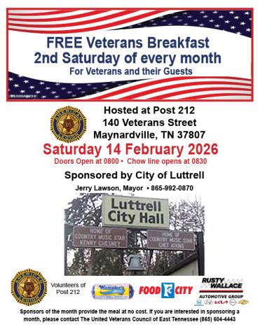 Veterans, their families, friends, and supporters are all invited to the monthly free breakfast at the American Legion Post 212 on Saturday, February 14th! Meet and greet starts at 8:00 am, and a substantial, delicious breakfast prepared by the Food City bakery and deli starts at 8:30! This breakfast is sponsored by the City of Luttrell. Thank you so much for supporting our Veterans! What an excellent opportunity to meet fellow Veterans and for community members to show their support by showing up and eating!