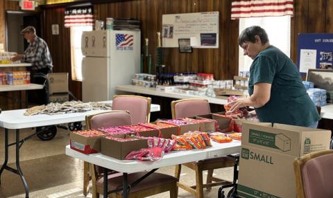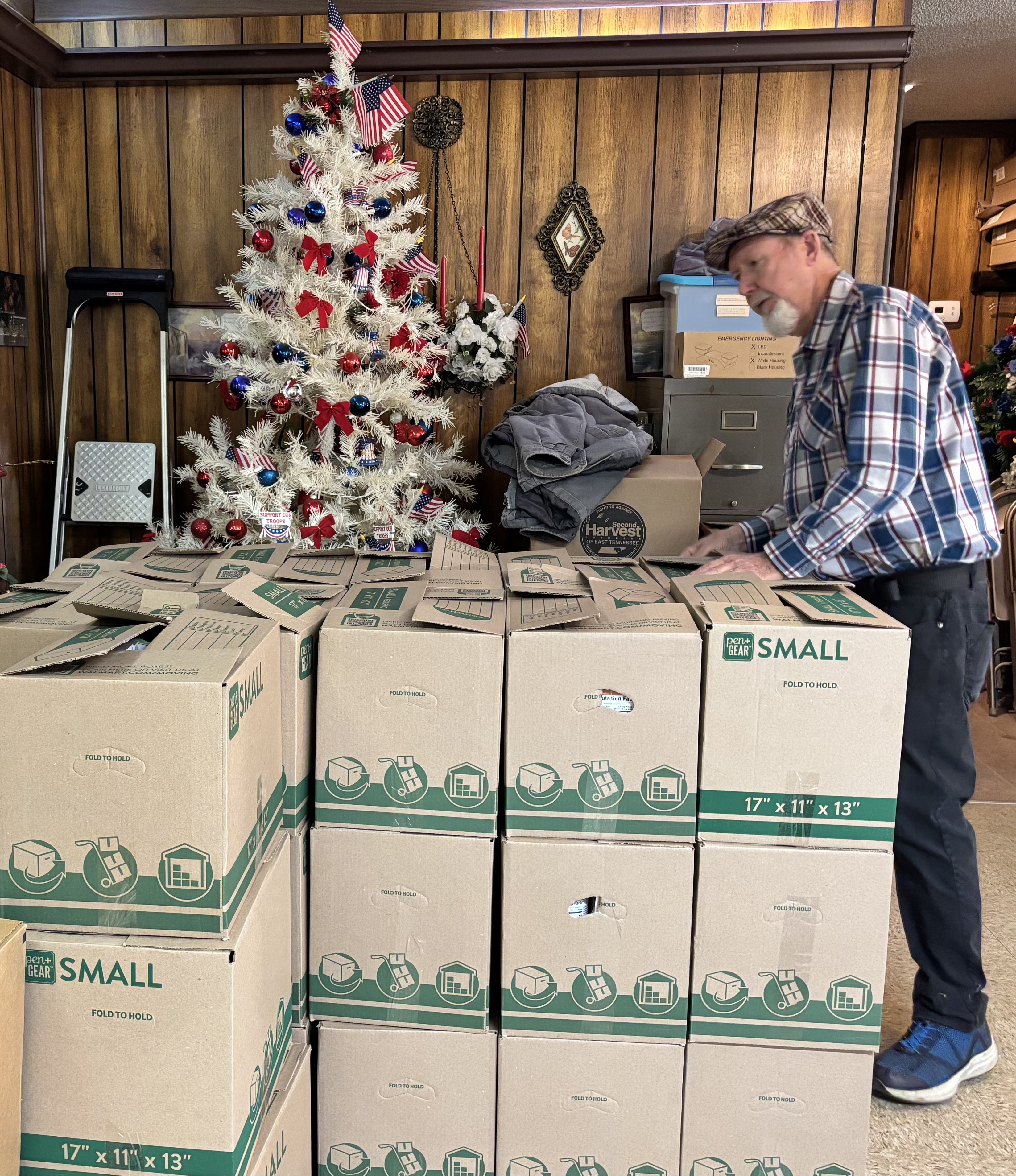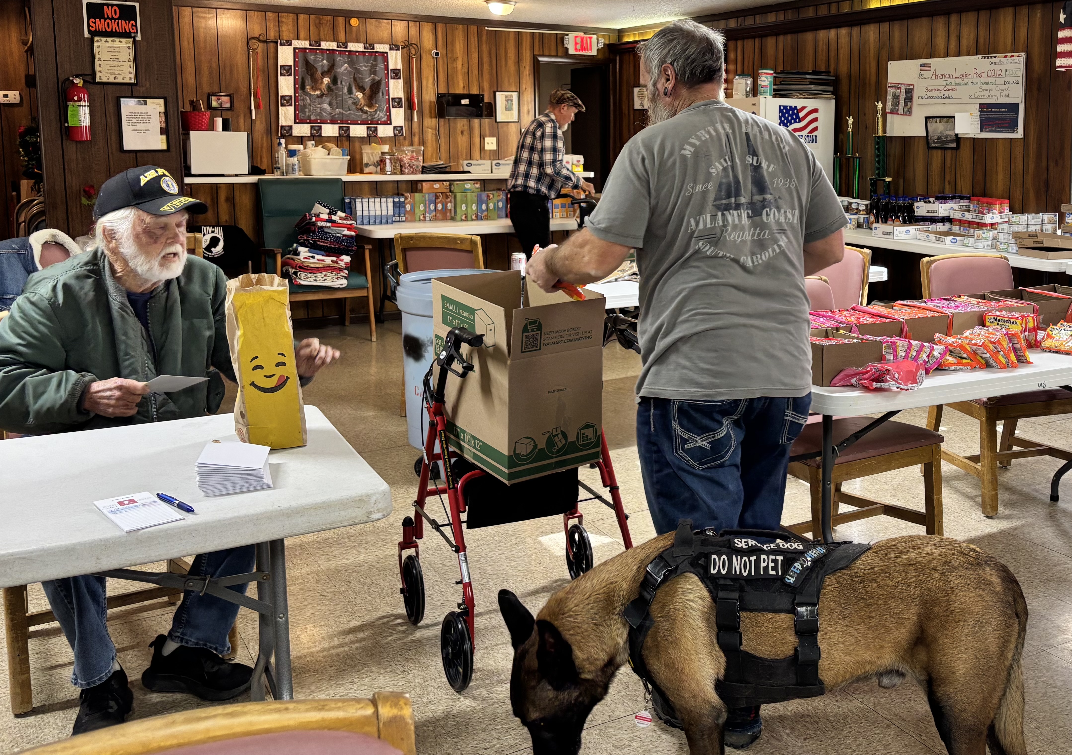 Every Christmas, the Veterans purchase food items and pack gift boxes for Veterans and their widows/widowers. This week, Lynn Sexton (US Air Force), TJ Stanley (US Navy), Arnold Smallin (US Army), Kara Johnson (US Army), Samuel Buchanan (US Navy) (ably assisted by his service dog Obie (Belgian Malinois)), and the new Veteran Service Officer (VSO) Mark Cook all worked together quickly and efficiently to form boxes and pack them to the brim. The boxes were distributed throughout the county to those who can use them. The Veterans tell me that the widows/widowers of Vets had the most challenging job of all – holding down the fort, raising the kids, keeping house while their spouses were defending our country, and they want to be sure that they are appreciated and not forgotten.