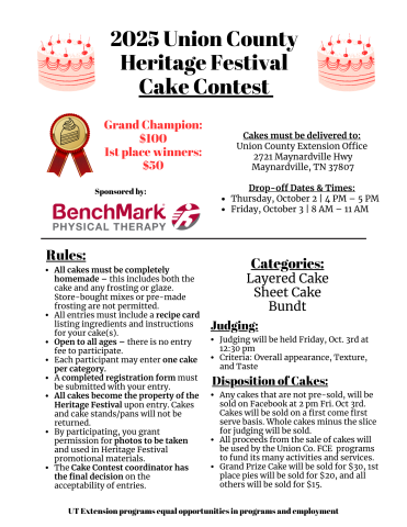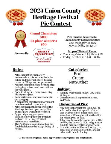 The Cake & Pie Contests are back at the Union County Heritage Festival—Friday, October 3rd! This sweet tradition is serving up $500 in prize money for the best bakers in Union County.