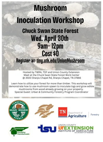 The Union County Extension Office, in partnership with the Tennessee Wildlife Resources Agency (TWRA) and the Tennessee Department of Agriculture’s Forestry Division, is offering a free Mushroom Inoculation Workshop on Wednesday, April 30th from 9 a.m. to 12 p.m. at Chuck Swan State Forest.
