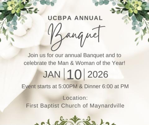 The UCBPA Annual Banquet is on Saturday, Jan 10th @ 5PM at First Baptist Church Fellowship Hall in Maynardville. The program begins at 5:00 and dinner is served at 6:00. Pete's Place will cater the meal of roast beef, grilled chicken, party potatoes, spinach marie, salad, and killer cake. The 2025 Man and Woman of the Year are Trevor Jones and Elizabeth Tindell. Come out and celebrate their accomplishments, enjoy a sumptuous meal, and have fun outbidding for some special auction items.