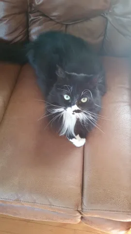 Even though starved and close to death, anyone could tell this kitten was a beauty. I learned from a book I saw at Ollie’s that she was a domestic longhair. She is mostly black, with white paws and a white chest, her nose half black and half white. The pads on her feet are pink, and half her nose is black, the other pink. She has always had the most gorgeous whiskers, long and white.