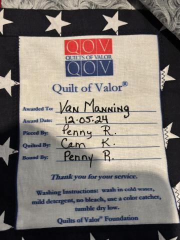 Bill Manning lives in Maynardville. His brother, Van, lives in Maryville. Van was just honored by the Quilts of Valor at the Seymour Heights Christian Church. The mission of the Quilts of Valor Foundation is to cover service members and veterans who have been touched by war with comforting and healing Quilts of Valor. So far in 2024, 35,333 people have received a Quilt of Valor. Over 408,000 total quilts have been awarded since the beginning of the project in 2003.