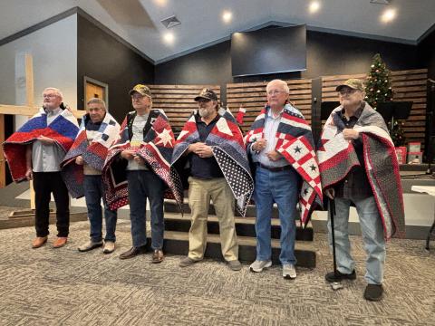 Van Manning was awarded a Quilt of Valor for his service to his country during wartime. Five other retired military were also honored with a quilt. They hailed from the Army, Navy, and Air Force and had various jobs during several wars including the Gulf Wars, Afghanistan, Somalia and Vietnam. The oldest veteran was 97 years old. The quilts were exquisite – no two were exactly alike.